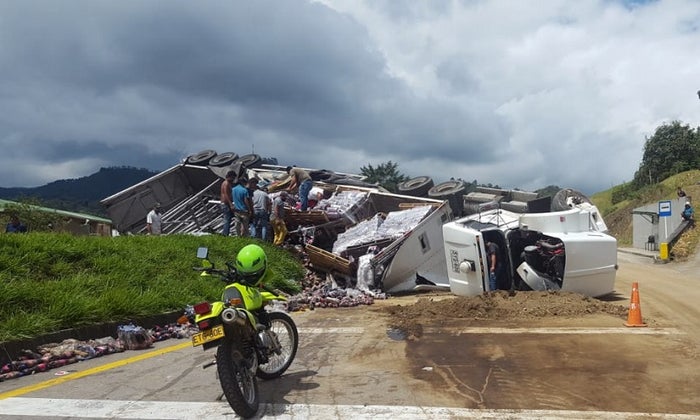 Una tractomula cargada de cerveza resultó volcada al perder el control de su conductor, quien al parecer sufrió un microsueño que llevó al percance en esa carretera de doble calzada.