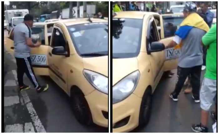 "Descarado, dizque trabajando", le gritaron a un taxista que no apoyó el paro en la capital antioqueña. Se ve como obligan al pasajero que llevaba a bajarse del vehículo.