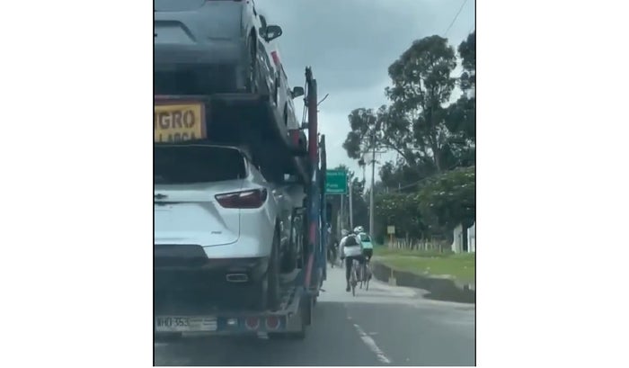 En redes sociales circula un video en el que se observa a dos ciclistas transitando por la vía Bogotá - Funza al lado de un camión de carga larga que llevaba otros vehículos en su parte trasera. Los hechos al parecer ocurrieron el pasado jueves.