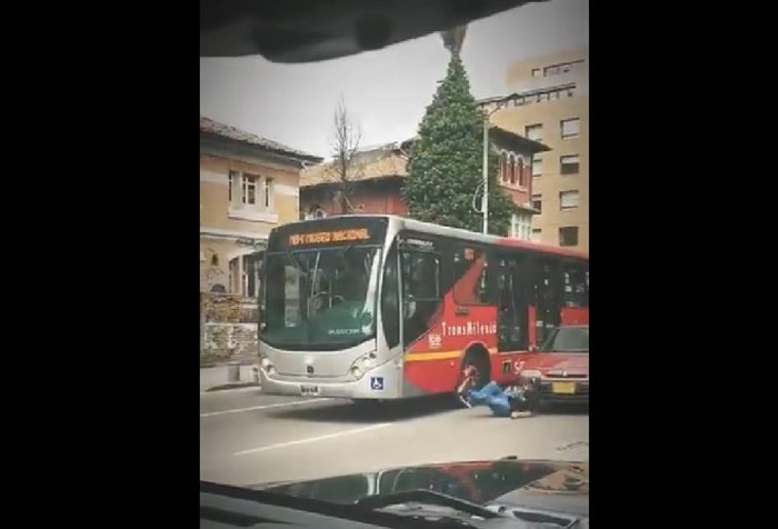 El bus aceleró un poco y el sujeto, inexplicablemente, trató con sus brazos de detener el avance del Transmilenio. El hombre, al ver que su estrategia no surtió efecto para detener el vehículo, va hasta la ventana del conductor y trató de pegarle, pero en su intento saltó y cayó mal al piso.
