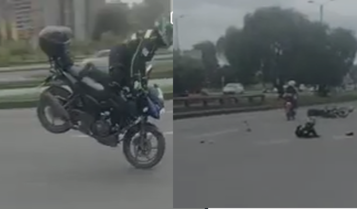Unos segundos después de este comunicado, se observa que una moto pasa por ese bache ubicado en las Américas, después de la Avenida 68, occidente de Bogotá, y se levanta la llanta delantera, por lo que queda manejando solo con la trasera, hasta que pierde la estabilidad y se cae.