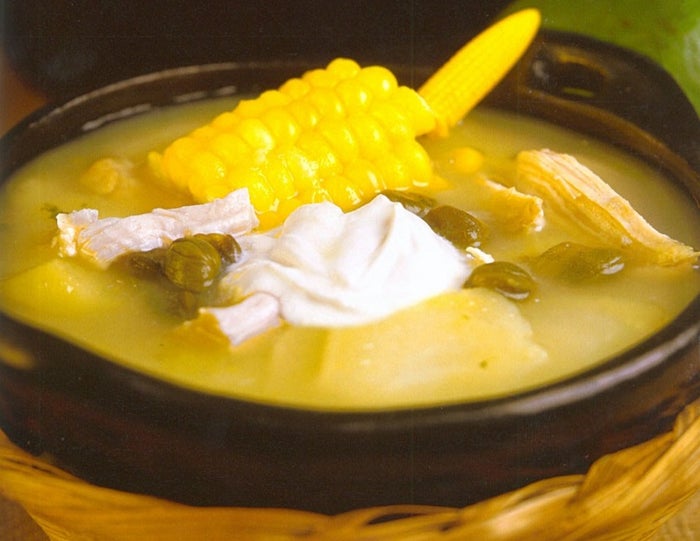 El ajiaco, un plato tradicional bogotano, se distingue por sus tres variedades de papas (pastusa, criolla y sabanera), guasca, cebolla larga, pollo y mazorca.